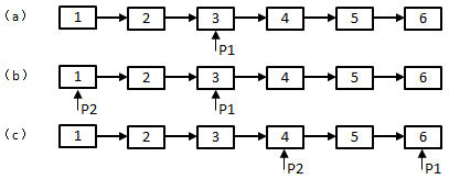 We have a better solution to get the kth node from end with two pointers. Firstly we move a pointer (denoted as P1) k-1 steps beginning from the head of a list. And then we move another pointer (denoted as P2) beginning from the head, and continue moving the P1 forward at same speed. Since the distance of these two pointers is always k-1, P2 reaches the kth node from end when P1 reaches the tail of a list. It scans a list only once, and it is more efficient than the previous solution.